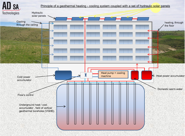 For such type of installation, which is more complex and more expensive than a unique VGHE used for a family house, it is important to precisely calculate and size the future VGHE’s field, the solar panels and the installations producing the heat and the cold, according to energetic needs. In fact, it is important to balance as well as possible the heat and cold injection in order to avoid freezing or overheating the ground.